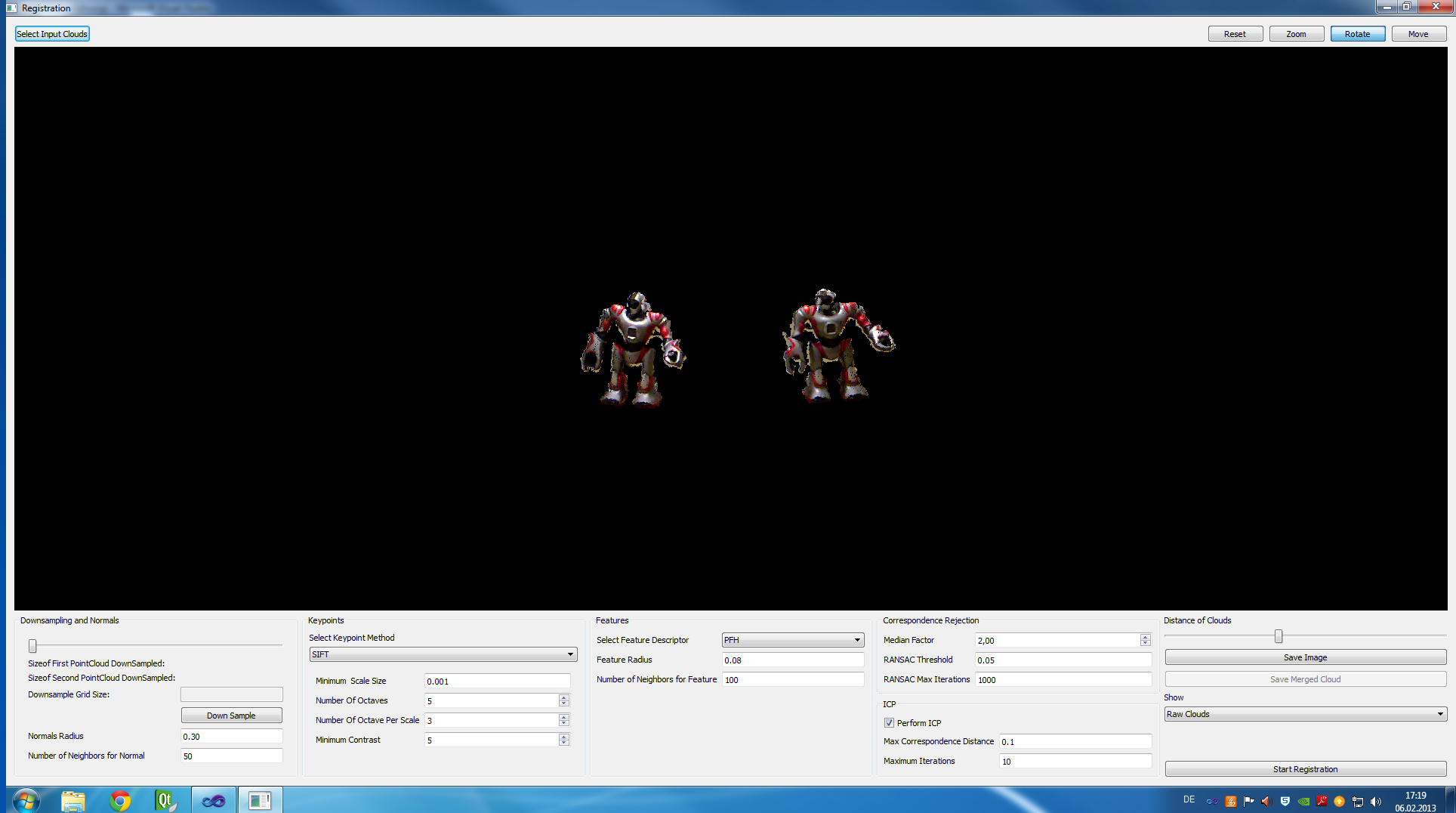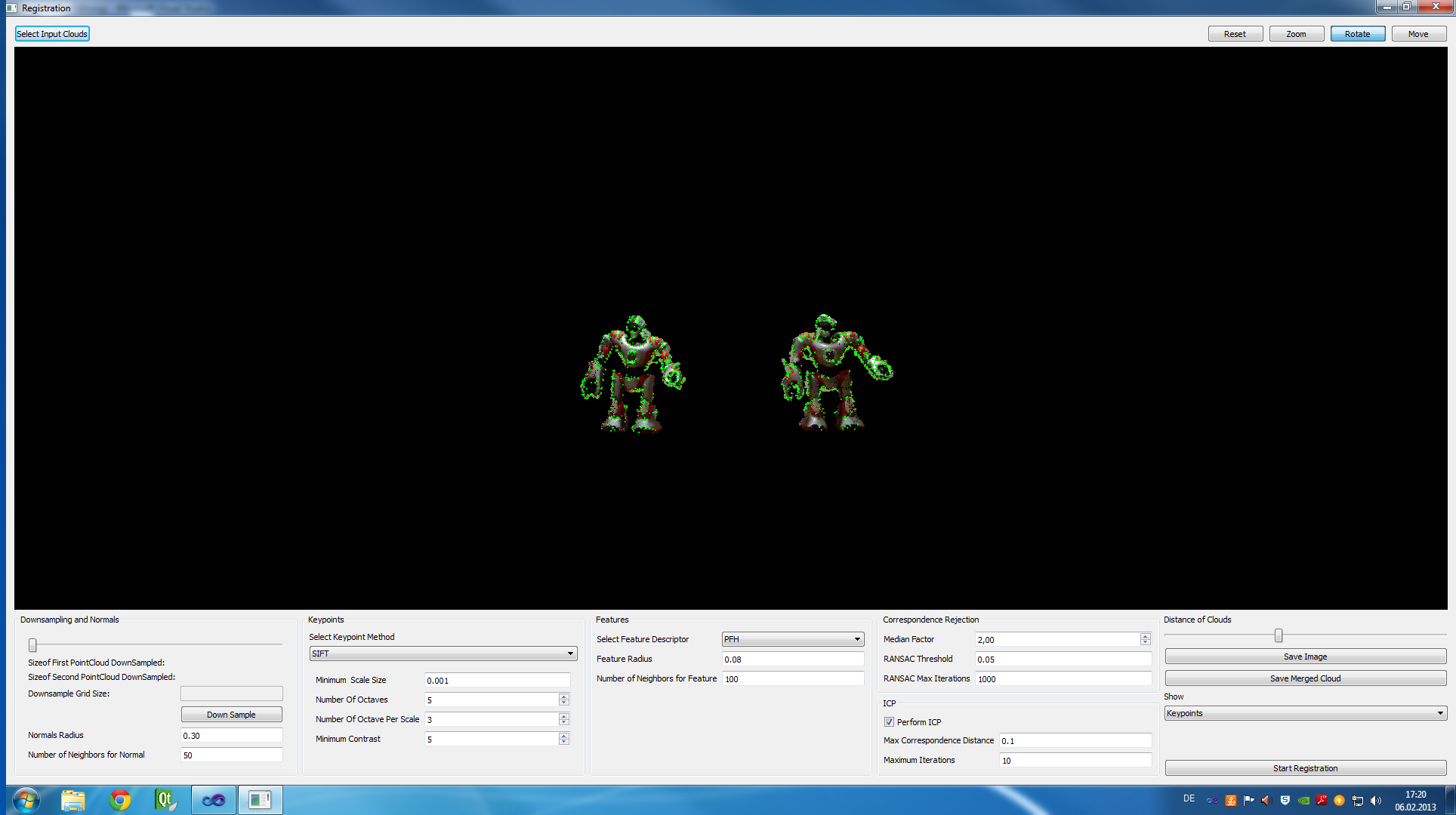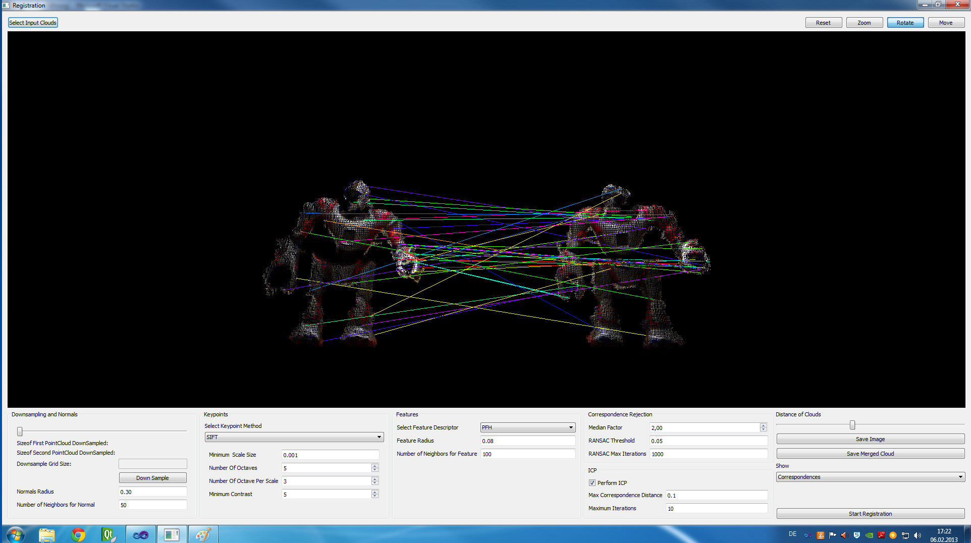 1)Importing point cloud acquired from different angles, down sampling, selecting keypoint extractor method SIFT, NARF, Harris, SUSAN and respected parameters