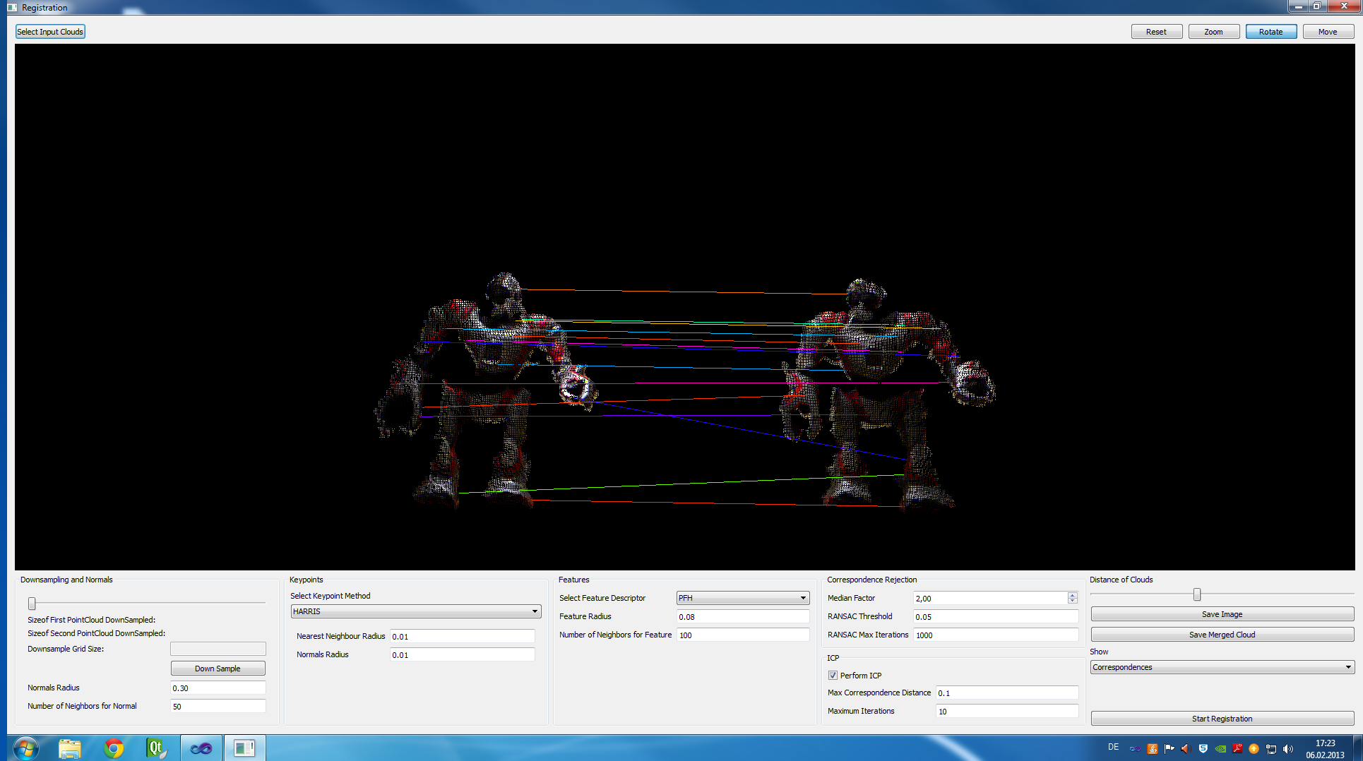 4) Correspondent points are rejected via several algorithm and from the remained correspondent points a 4×4 transformation matrix is computed