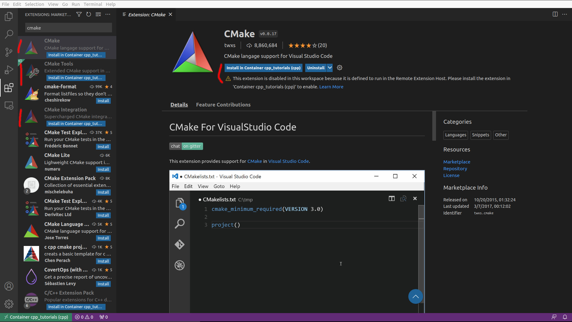 Now you should reinstall your extension such as C/C++ CMake, CMake Tools, CMake Integration in the container: