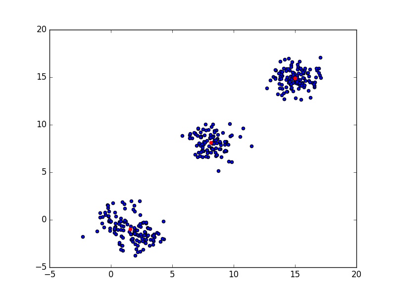 of \( C \) indicates a good clustering. In the following code, I have generated 4 clusters, but since two of them are very close, they packed into one and the optimal number of clusters is 3.