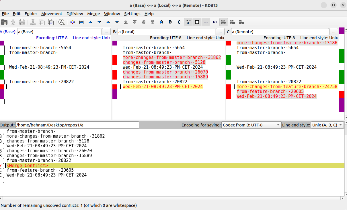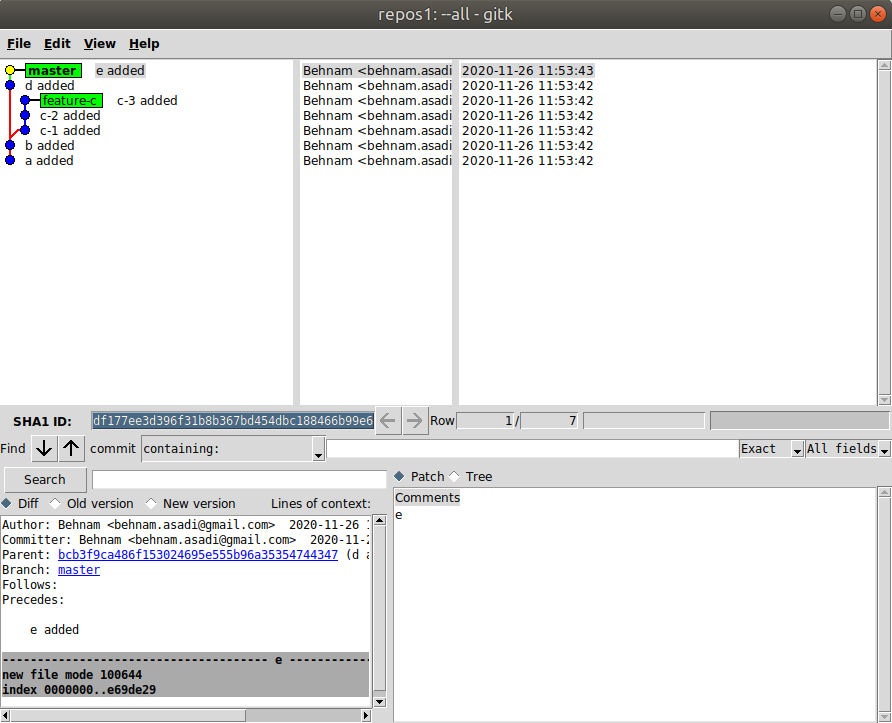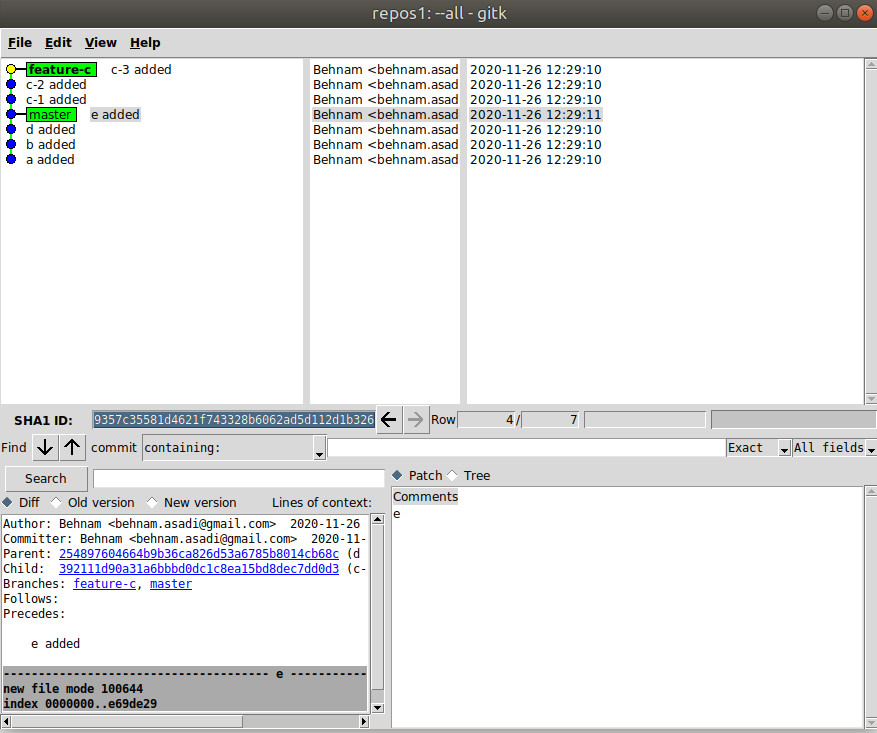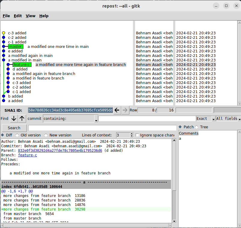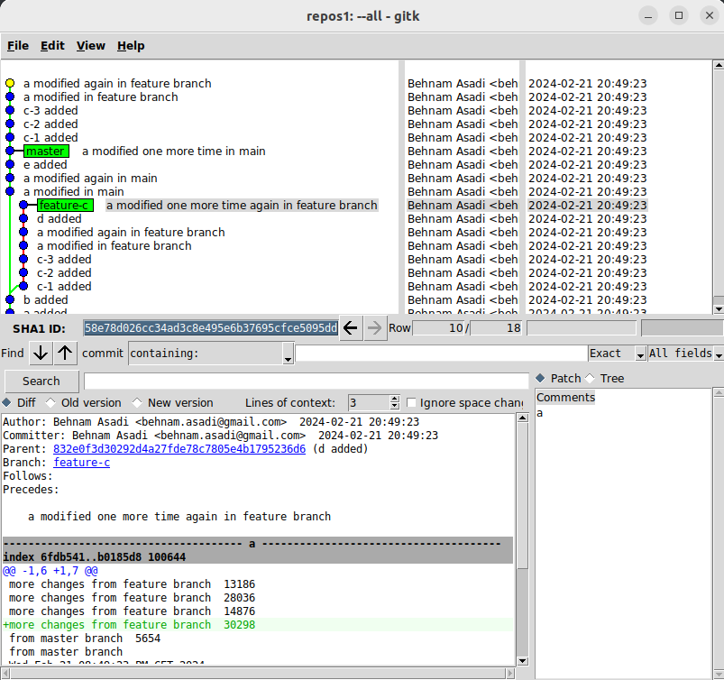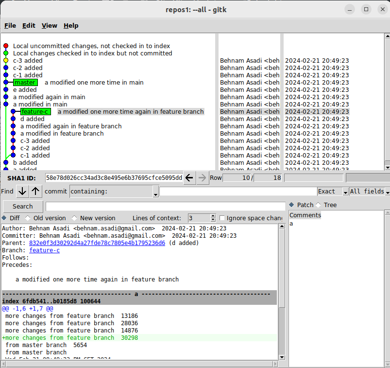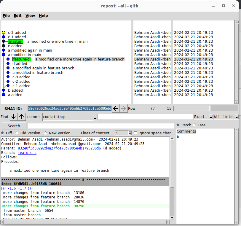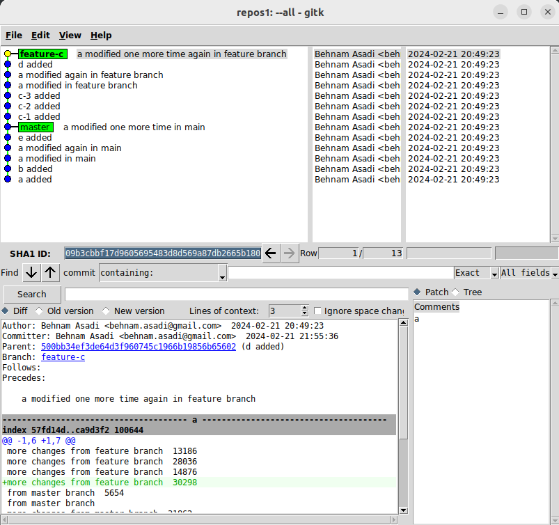 When you create a feature branch and start working on that, your master might grow and also your branch. Let’s create a repository and add “a” and b: