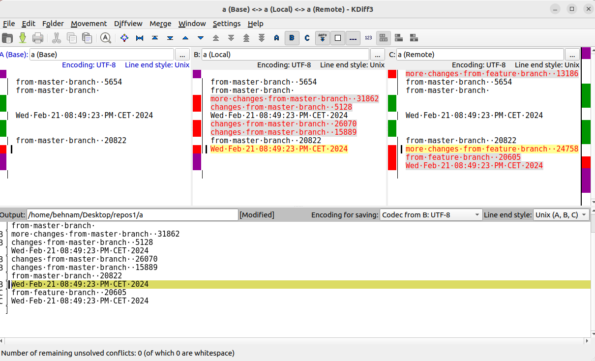 Now in the above, since we are applying commits from the feature branch on master, B the local is master and C is the feature branch that we are applying changes from