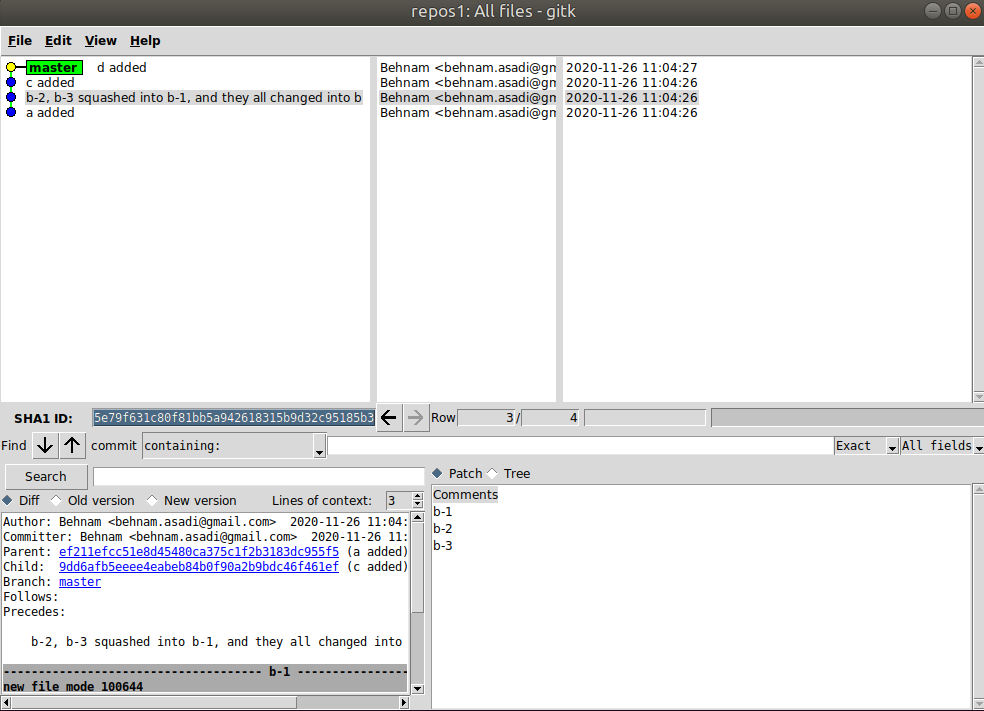 But now you would like to squash b-1, b2 and b-3 into one commit. So copy the hash ID of b-3 and execute rebase: